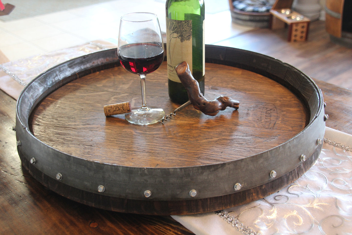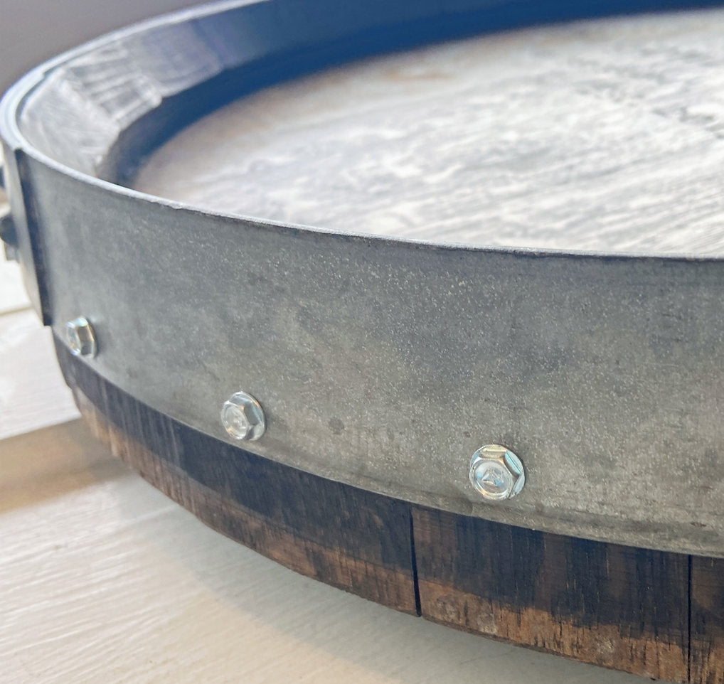 Wine Barrel Head: Features the signature red wine-stained underside and galvanized steel hoops for a polished, aged look