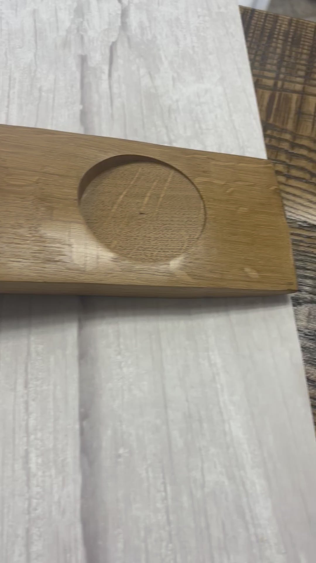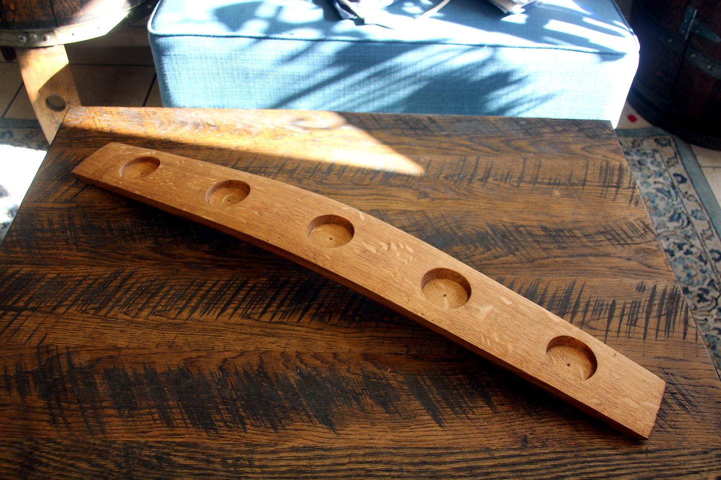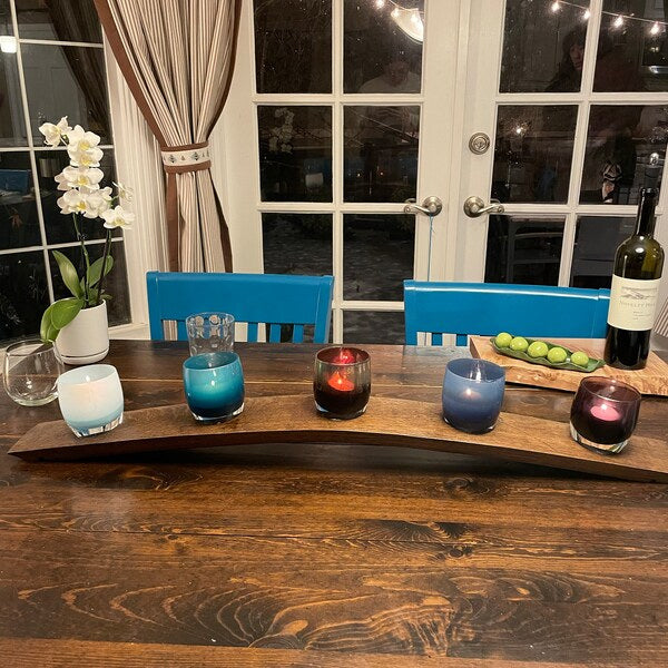 Designed with both form and function in mind, this candle holder is both practical and stylish. The sturdy and wide base ensures stability, while the elegant and minimalistic design complements the unique colors and shapes of the Glassybaby candles (not included). This means that this holder is not just a practical accessory, but also a stunning display piece. The wood can be stained in one of three stain colors ( Dark Walnut, Natural, Red Mahogany) and finished to showcase the beauty of the wood grain and the natural warmth of the wood. The underside of the candle holder showcases a deep red/burgundy stain from the wine that was once aged in the barrel.