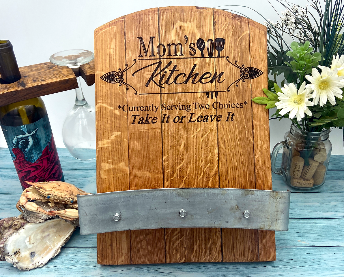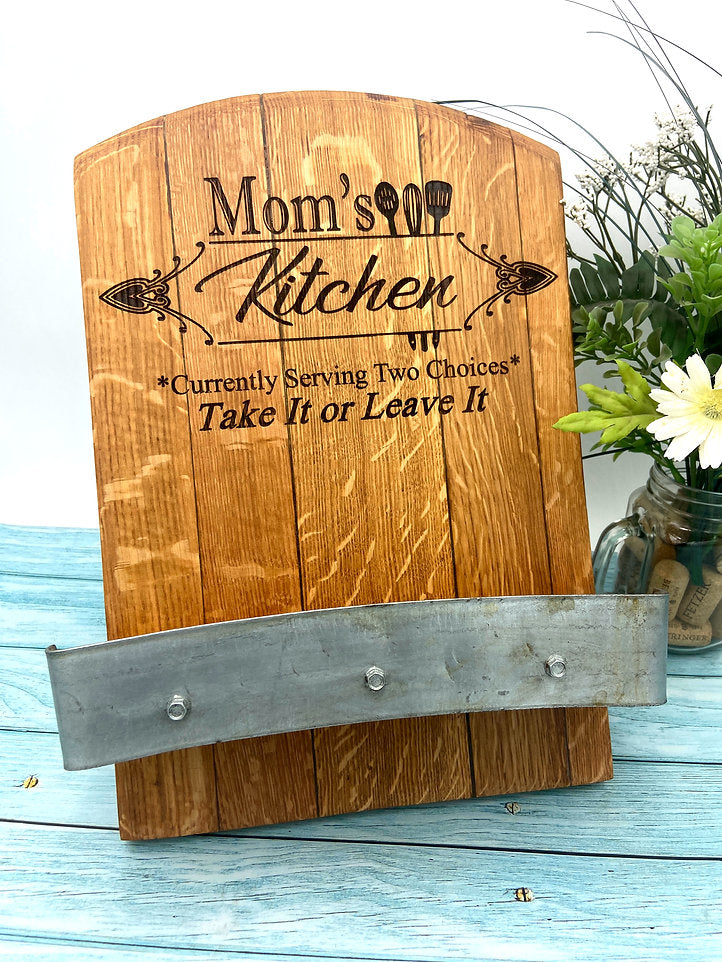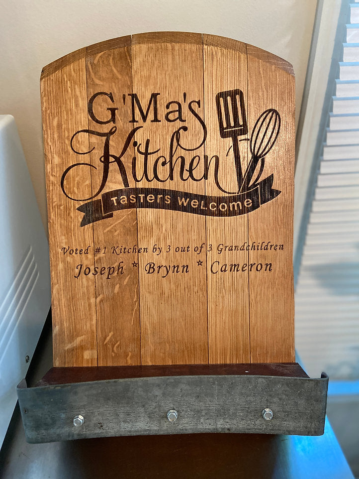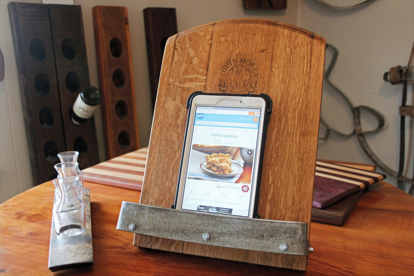 Wine Barrel Recipe Book Holder – Rustic Tablet & Cookbook Stand with Optional Engraving