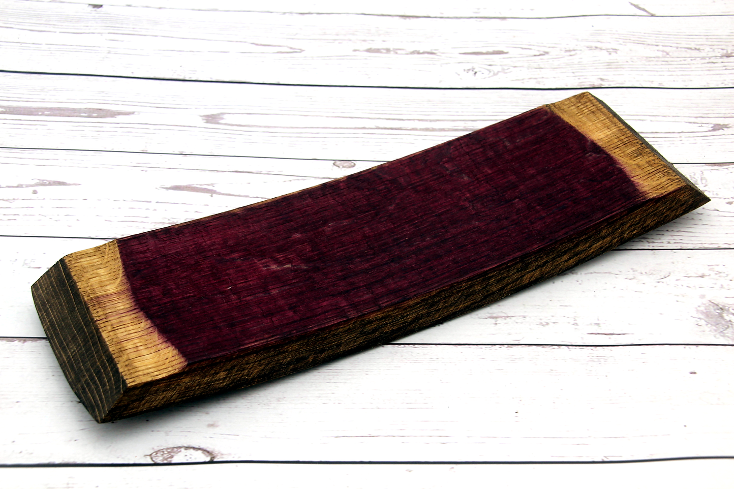 Crafted from reclaimed red wine barrel staves, each piece showcases natural curvature and subtle burgundy wine staining from its original life in the vineyard.