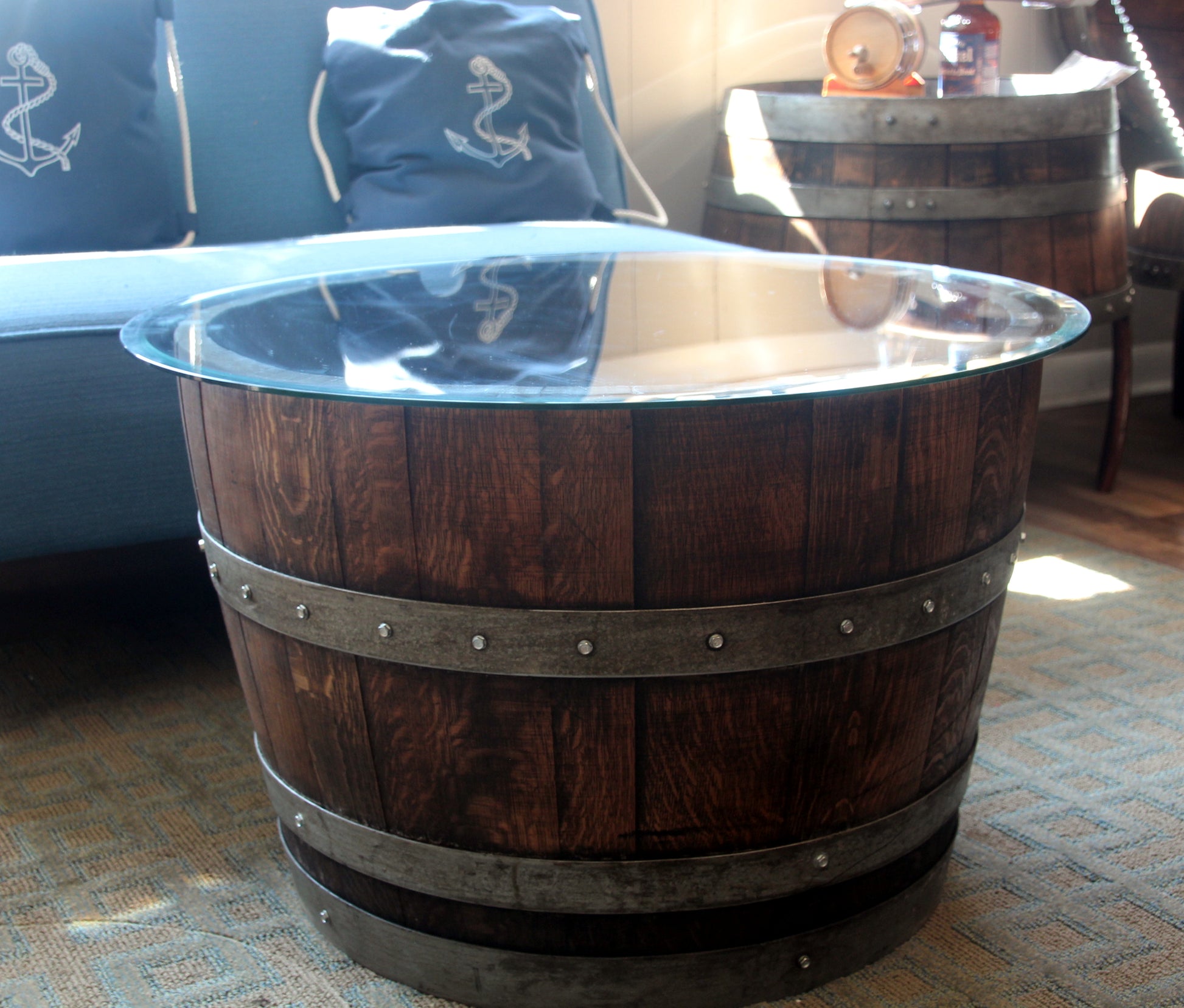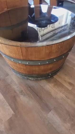 Barrel Coffee Table with Glass Top – Reclaimed Wine or Whiskey Barrel Furniture with Hidden Storage