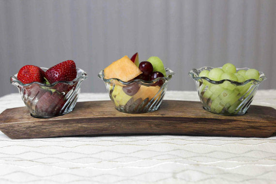 Wine Barrel Dessert Flight – 3-Bowl Barrel Stave Dip & Snack Server with Glass Bowls